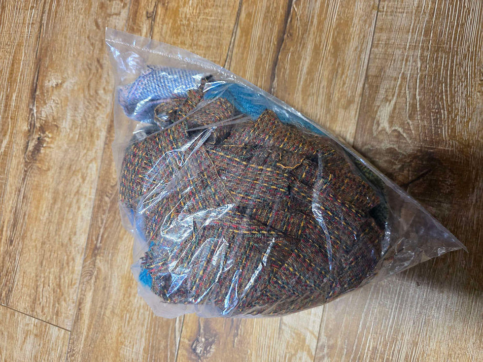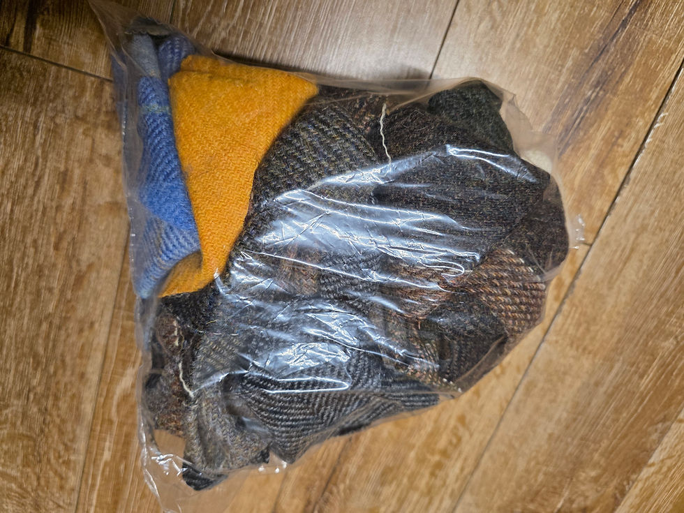 Handwoven by myself or other Islanders from pure wool. These scrap bags and offcut pieces are perfect for patchwork, quilting and small projects such as jewellery, keyrings, purses, cufflinks etc! The yarn ends are great for embroidery, stumpwork, needle felting, small looms etc